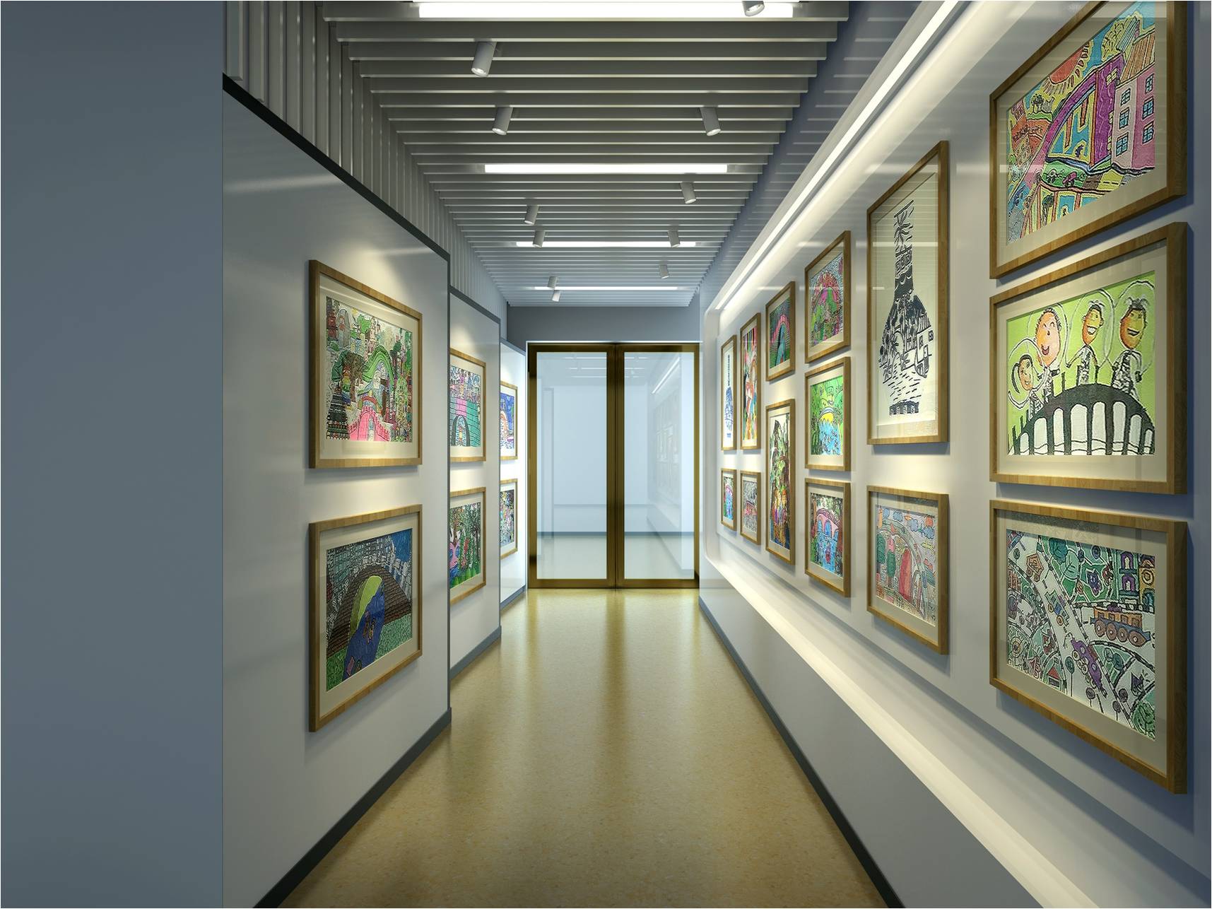 入口結合學校輔助圖形綠色墻面與翠微賦的結合及辦學特色的墻面設計直接將參觀者置于濃濃的文化氛圍中展示了教育的品牌特色。地面不同顏色的色帶將空間功能分布簡單明了的說明給參觀人員。