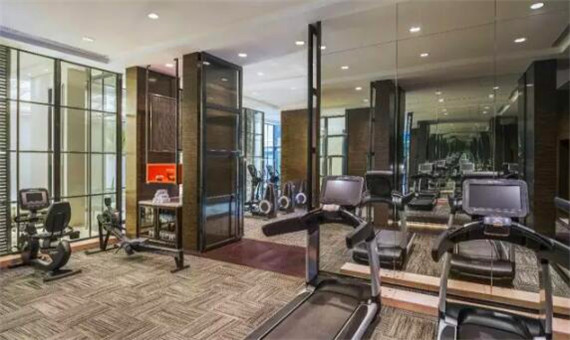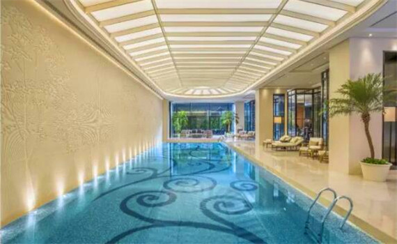酒店配套的泳池、健身中心。泳池設置在玻璃中庭內,獲得充足的自然光線,周圍的各種盆栽灌木、樹木和綠植營造出一排寧靜安詳的愜意氛圍。