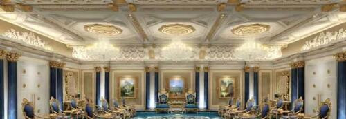 貴賓區則采用金色與藍色色調的融合,藍色定制地毯及定制軟裝家具,讓貴賓在此感受尊貴典雅專屬空間。