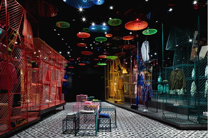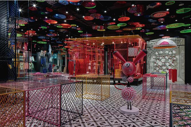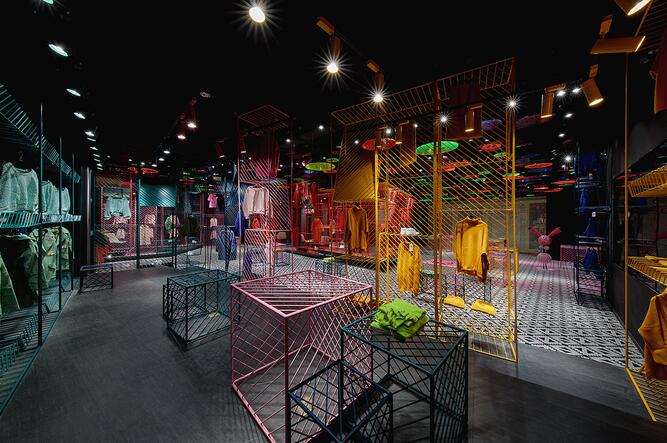 潮女區大色塊的撞色,由一根根鐵藝曲折而成的彩色貨架,在這個強調個性的空間,利用衣架的前后折度來分割成雙面掛衣的結構,彩色與折線的拼織來打造幻彩個性的空間已來呼應該空間里服裝展現的個性。