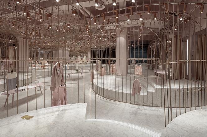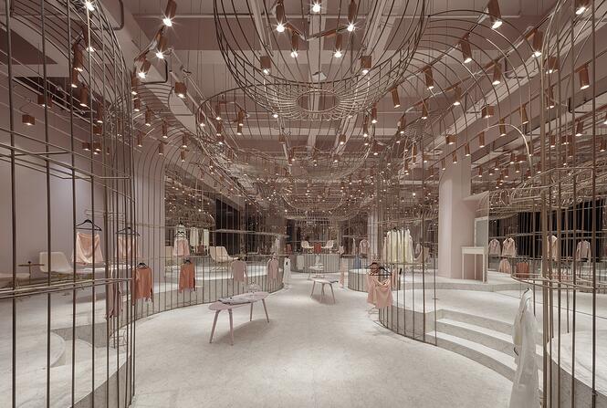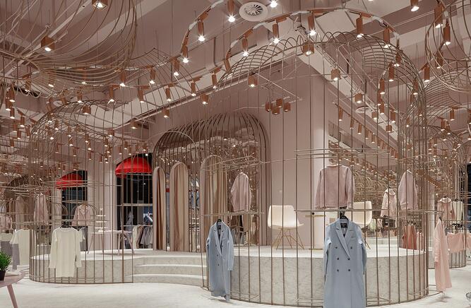名媛區,一個個精致的金絲籠,衣架被放在金絲籠內外兩側,遠看仿若被精心呵護的公主蓬蓬裙。高低起伏的弧形平臺,增加趣味性的同時又不失活潑可愛。試衣間被巧妙的隱藏在弧形鏡面的“蓬蓬裙”內側。同時每個試衣間區域也提供梳妝、休憩、自拍區,等待著每一位公主。