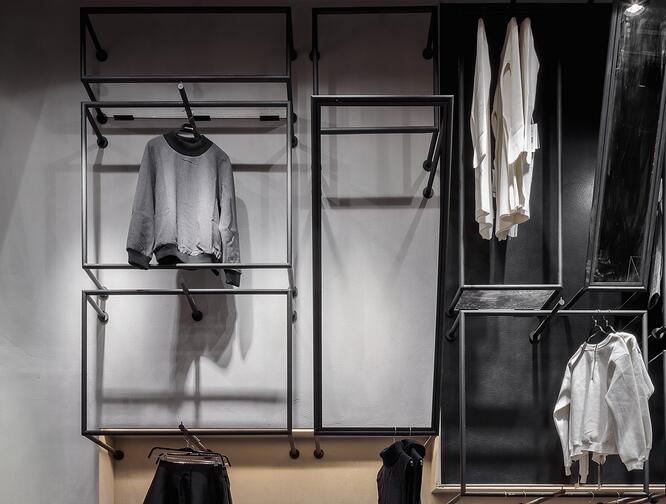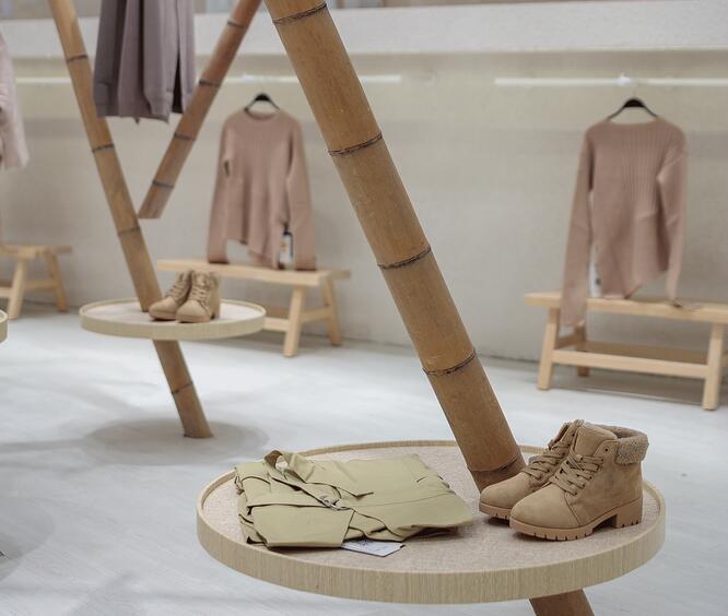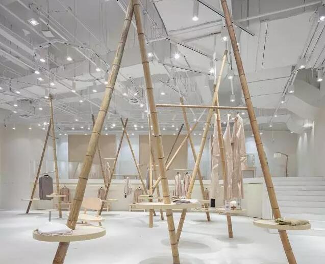 通過主入口區大大的門拱,進入到森女區。乳白色肌理墻面,白色地面,一個潔白干凈的空間,支立著一根根竹竿并以麻繩做連接,而衣架也就此成型。穿衣鏡則隱藏在兩根竹竿的夾角立面上。空間明亮簡潔并用古樸的材料來呼應該空間衣服類型的氣質。