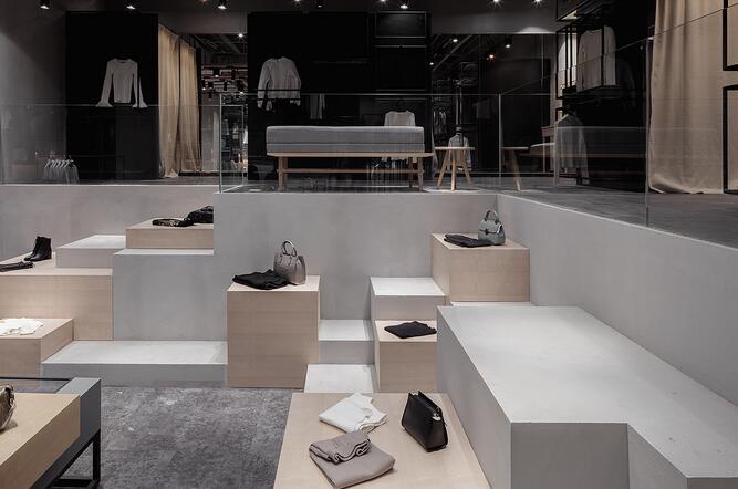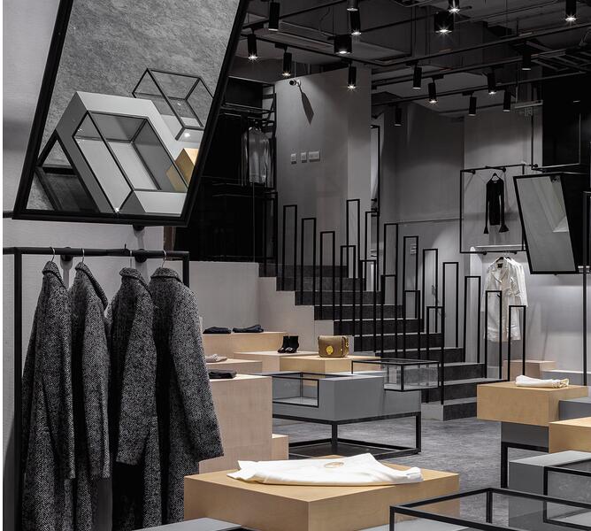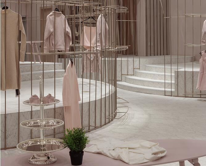設計師整合了女裝品牌四大類型服裝背后的社會與文化含義通過四個空間的不同的設計手法來演繹了女裝背后的穿衣哲學并且通過多種陳列的可能性創造了全新的購買體驗感。