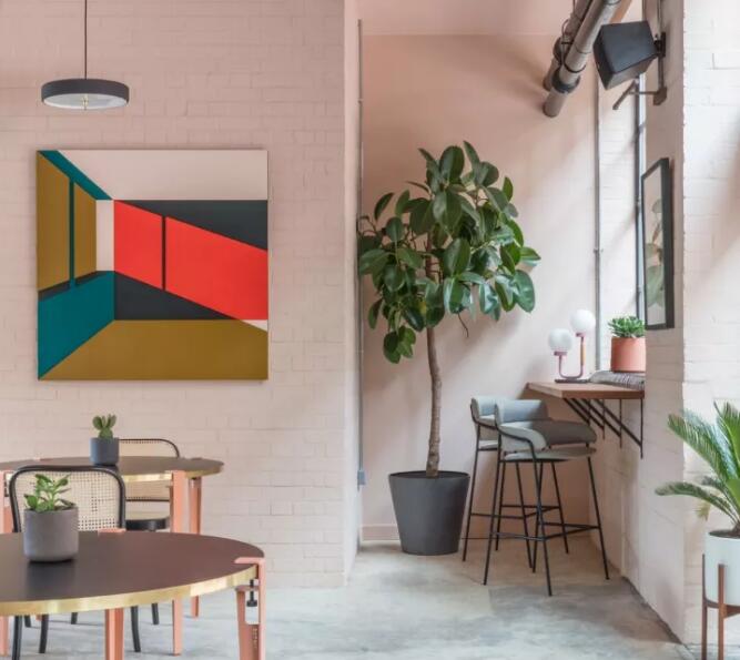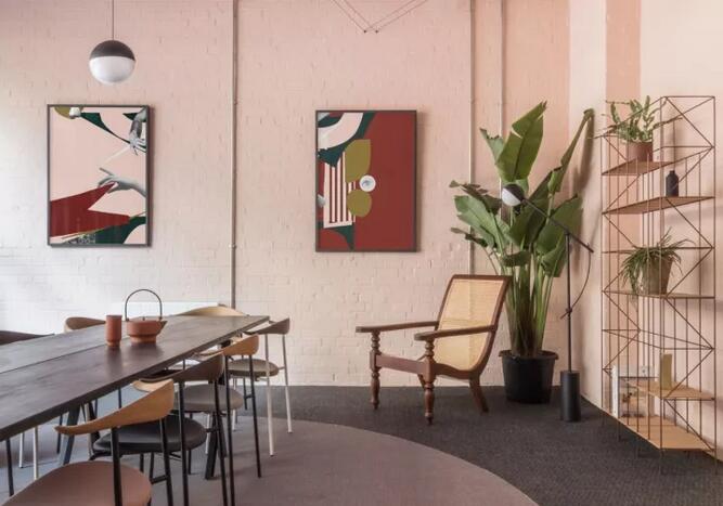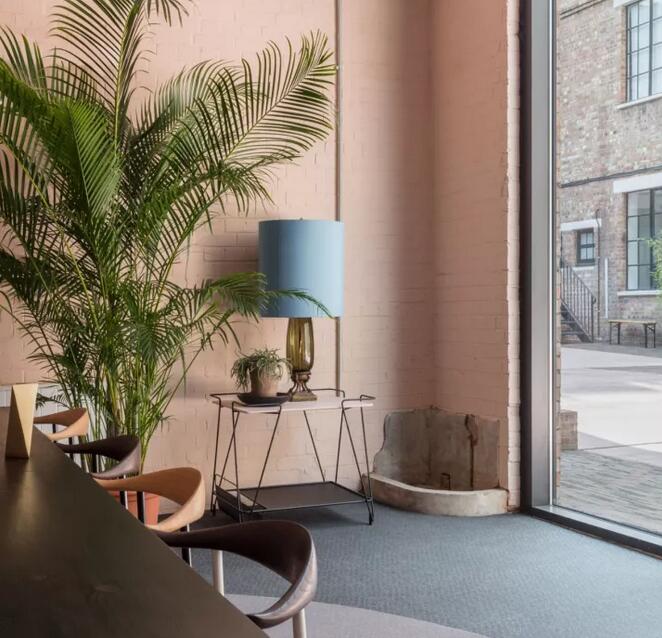 會客區(qū)中長條狀木制桌子搭配20世紀早期的戶外椅、網(wǎng)格狀書柜,整體氛圍尤其適合辦公。一部筆記本、一杯拿鐵和一本雜志值得沙發(fā)中沉溺一天。 石膏粉紅色的磚砌,光滑的混凝土地板,清新的色調和多層次的綠色,是現(xiàn)代主義與洛杉磯街頭風交融的最佳呈現(xiàn)。