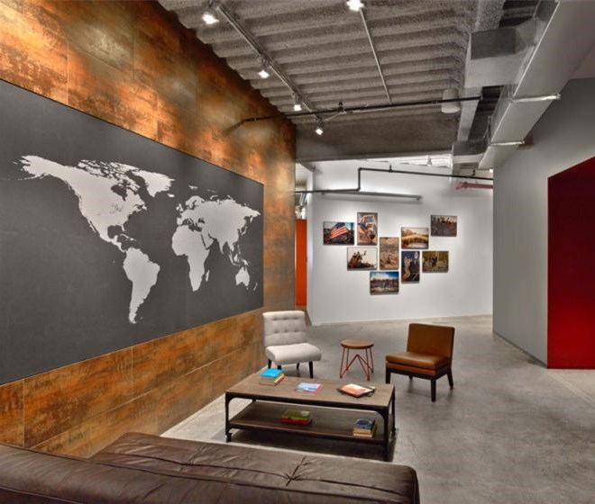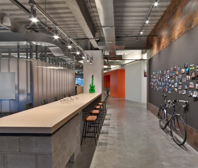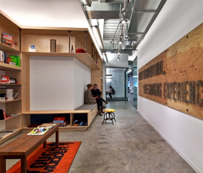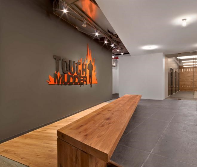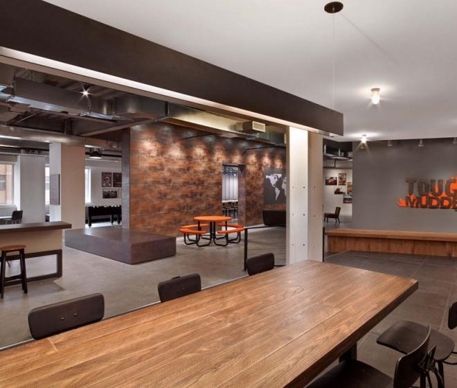 每個元素看起來都十分隨意,不過卻專業并且十分友好。從模仿考頓鋼的墻面到重新利用的木頭、印著Tough Mudder標志和簽名的水泥煤渣磚會議桌。該設計提供了一個現代美感與工業化魅力結合的空間。
