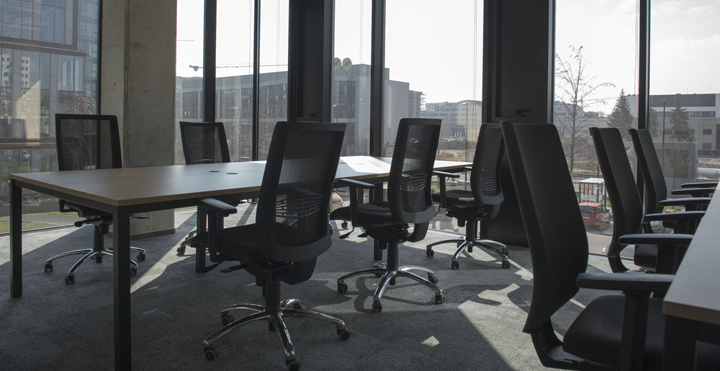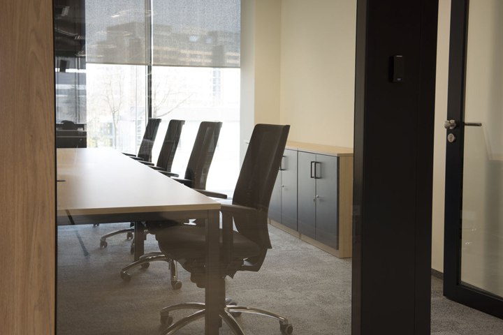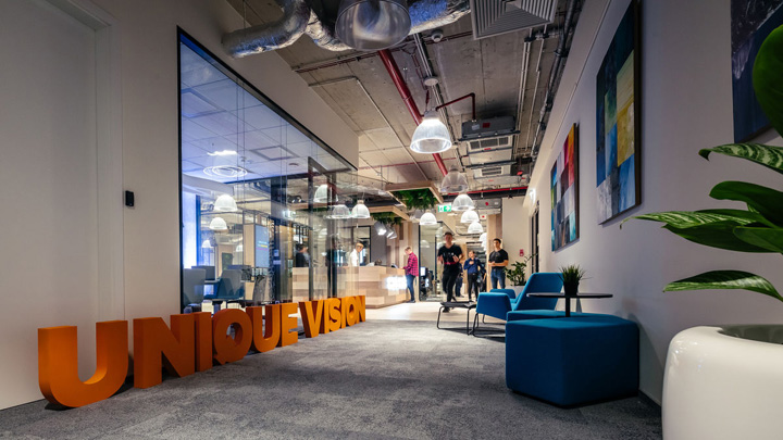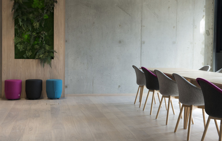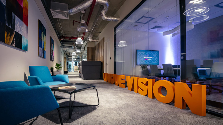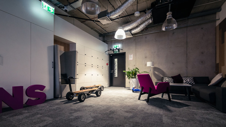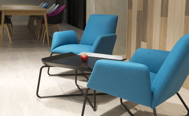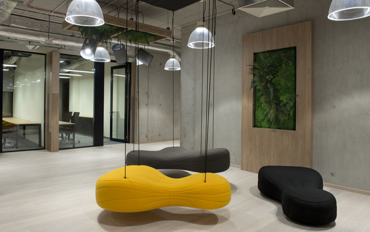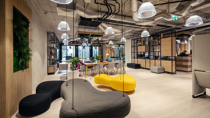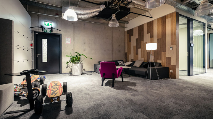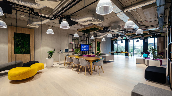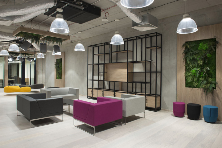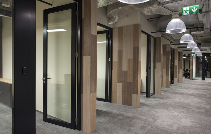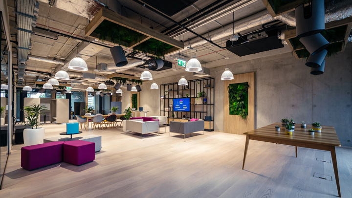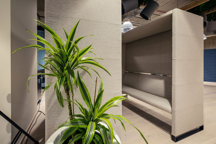 開放空間和輔助空間(文印室、茶水區、付費電話會議室、電話亭等)圍繞一處大型開放的廚房咖吧而設。黑色方管制作的展示架兼具實用和裝飾性,帶來強烈的工業美學特征。