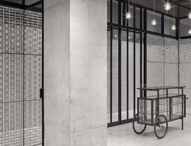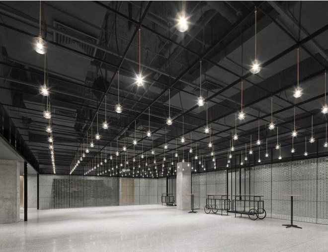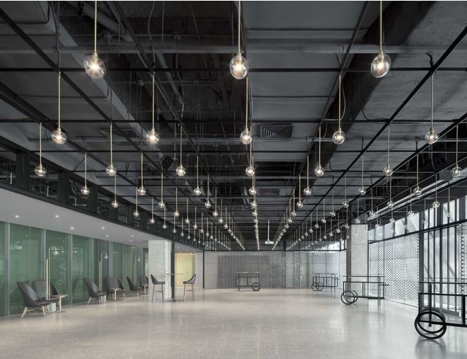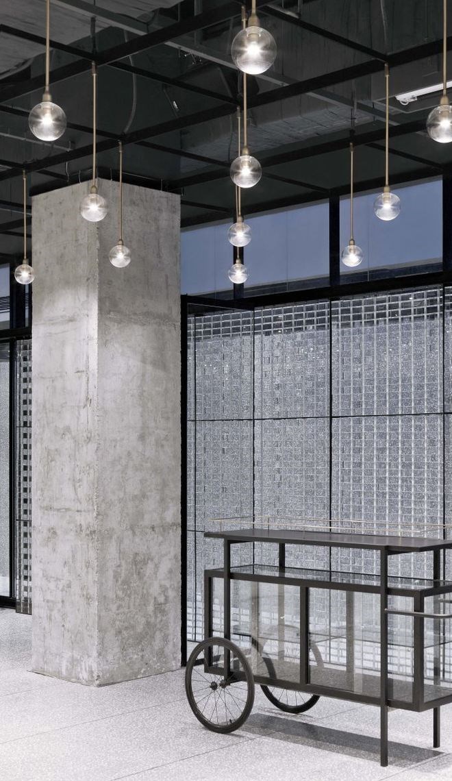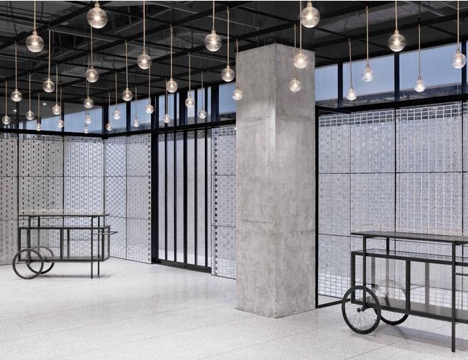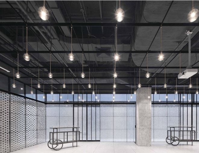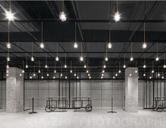 室內(nèi)擺放了定制的家具,例如以街邊攤販的推車為靈感而特別設(shè)計(jì)的移動(dòng)式餐車。定制的燈泡以矩陣形式懸掛排列,呈現(xiàn)出簡(jiǎn)單而優(yōu)雅的照明效果,同時(shí)也靈活適用與不同場(chǎng)合對(duì)空間的使用需求。