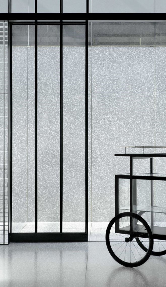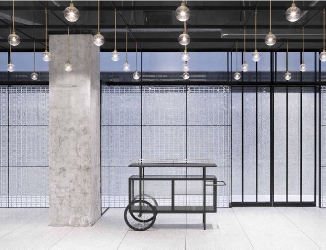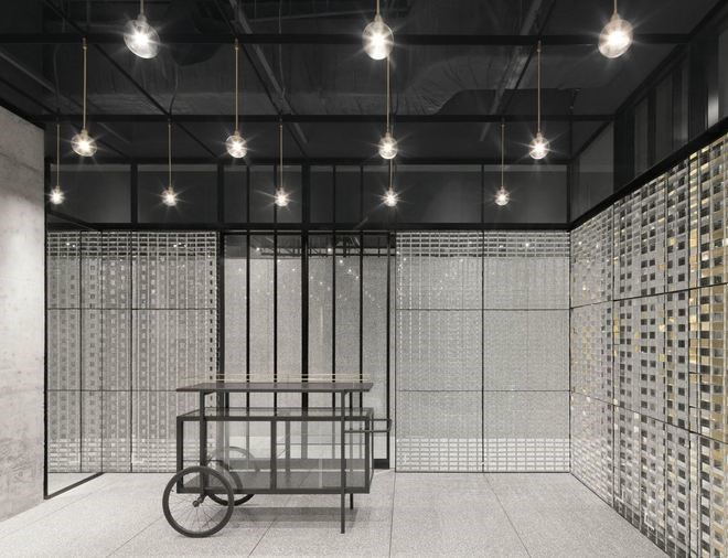 從北京隨處可見(jiàn)的灰色磚砌建筑中汲取靈感,玻璃盒子外殼由壓鑄玻璃磚按照傳統(tǒng)方法搭建制成。精心拼接后形成垂直的墻面系統(tǒng)。透明的墻面最大程度地將自然光引入空間內(nèi)部,帶來(lái)明亮而模糊的視野,從一定程度上保護(hù)了空間的私密性。
