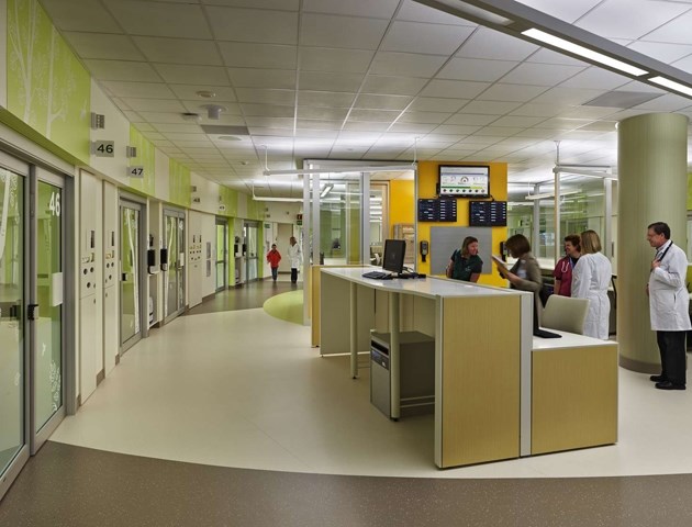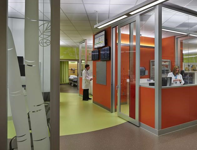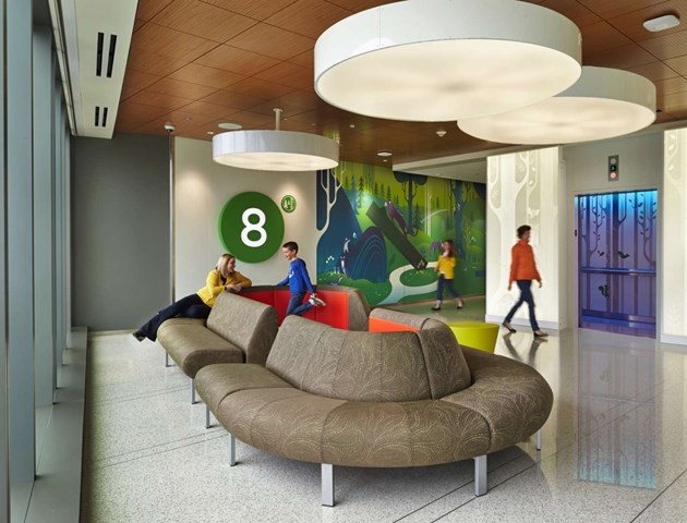 在這座大樓的設(shè)計(jì)理念中融入了自然和地區(qū)的概念,也給人提供了明確的方向,并且指明方向,能夠減少壓力。多層次的方式也應(yīng)用到音響設(shè)備上,對于提供一個(gè)有利于健康的環(huán)境十分重要。病人區(qū)的所有地板都是橡膠材質(zhì),能夠減少噪音。現(xiàn)代的干凈線條以及多彩的顏色建造了一個(gè)品牌故事,只有在西雅圖兒童醫(yī)院才有。不過這些以融合藝術(shù)為特色的室內(nèi)設(shè)計(jì)對于21歲以下的病人十分有吸引力。有趣的圖案和藝術(shù)設(shè)計(jì)給空間帶來了愉悅的元素。