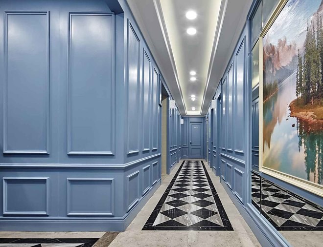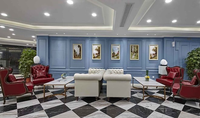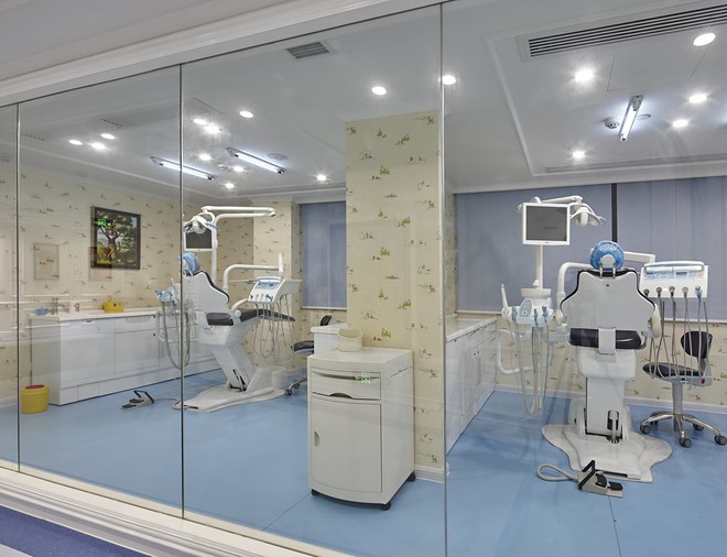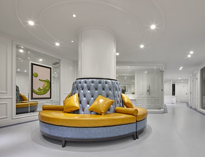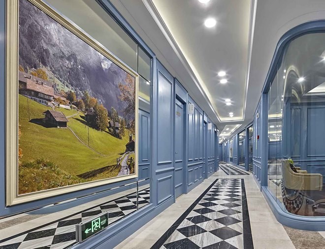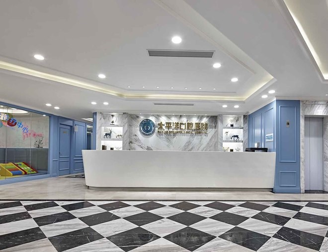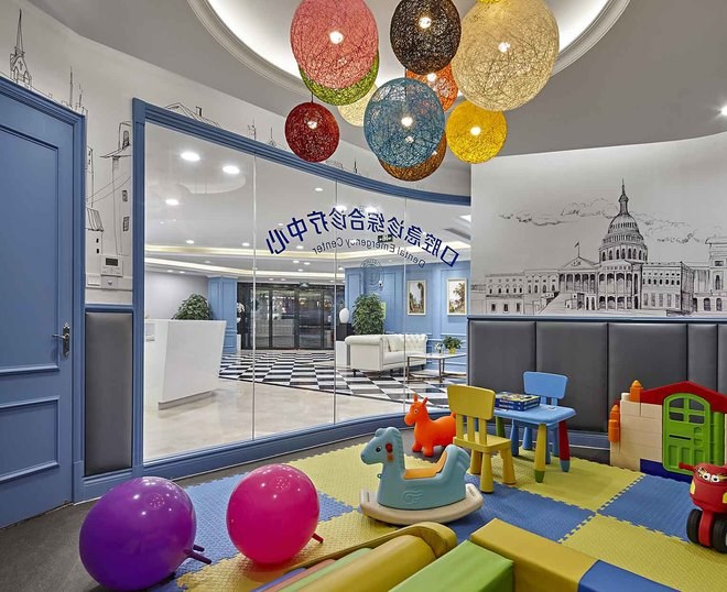 一層強調英倫的雅致及品位,用淺藍色歐式墻面穿插整個空間,強列的空間視角關系,讓客戶流連忘返,記憶深刻,達到商業醫院經營的目的。在本層還很貼心的設立了兒童娛樂區,在兒童娛樂區隨處可見的城堡元素、七彩吊燈、搖搖馬等仿佛讓兒童進到這里就感覺身處游戲城堡之中,大大緩解了就醫前的緊張心情。