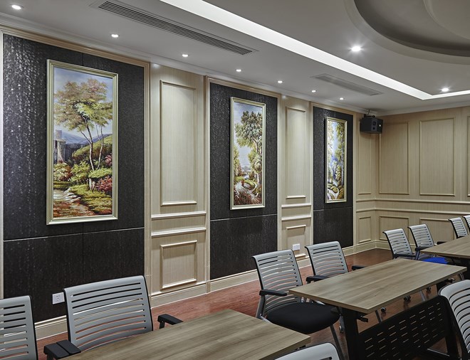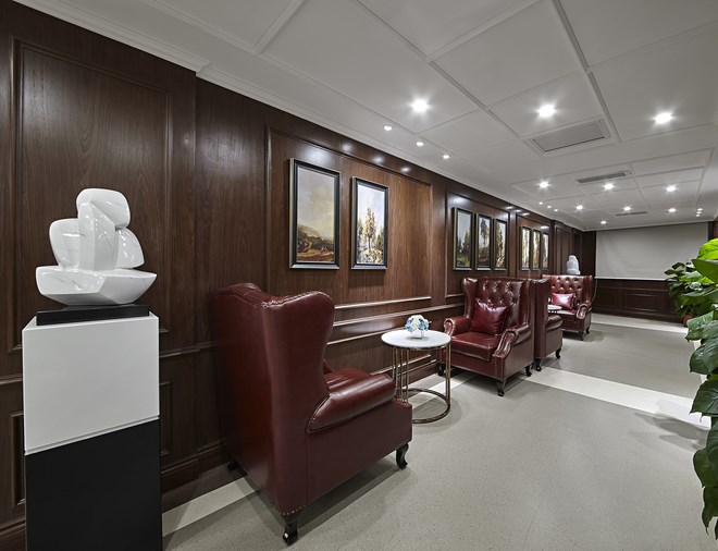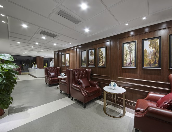 二層用整體白色木飾面墻面做設計構思,在大面積白色調的運用下彰顯清新格調和簡潔大方,極具醫院特色,又不缺味道與個性。曲折蜿蜒的走廊里,鏡面與油畫結合的墻面、大塊玻璃的運用,使得原本枯燥的走廊增添一份空間感。三層VIP客戶層,強調私密與品位,用深色木色系墻面處理整個空間關系,與之定位相關聯。四層手術層,強調空間的溫馨.用暖色調的空間氛圍來削除手術功能帶來的緊張度。